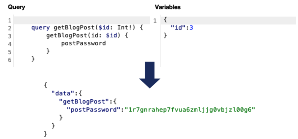 따라서 위와 같은 구성도를 통해 getBlogPost라는 쿼리로 요청할 수 있는 내용들을 알 수 있었습니다. 그중 flag 값이 담겨있을 것 같은 postPassword라는 내용이 있어 이를 쿼리에 담아 id 인자값을 3으로 설정 후 요청하였더니