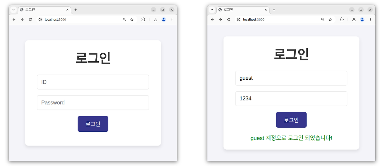 파라미터 값으로 userid와 password가 요청이 가면 그 내용을 데이터베이스에 조회하여 로그인 결과를 보여주는 로그인 환경입니다. 저는 실습을 할 때 guset와 admin 계정을 저장해두었습니다.