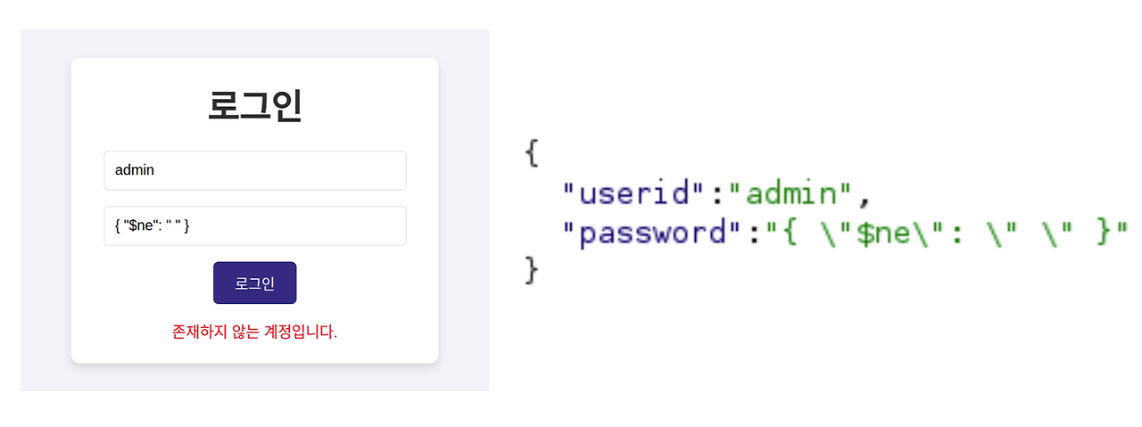 MongoDB에서 사용하는 쿼리 연산자를 사용하여 NoSQL Injection 공격을 할 수 있는데 해당 연산자를 포함하여 쿼리를 보내면 쿼리의 결과에 조건이 적용되어 나오기 때문에 원하는 결과를 얻을 수 있습니다.