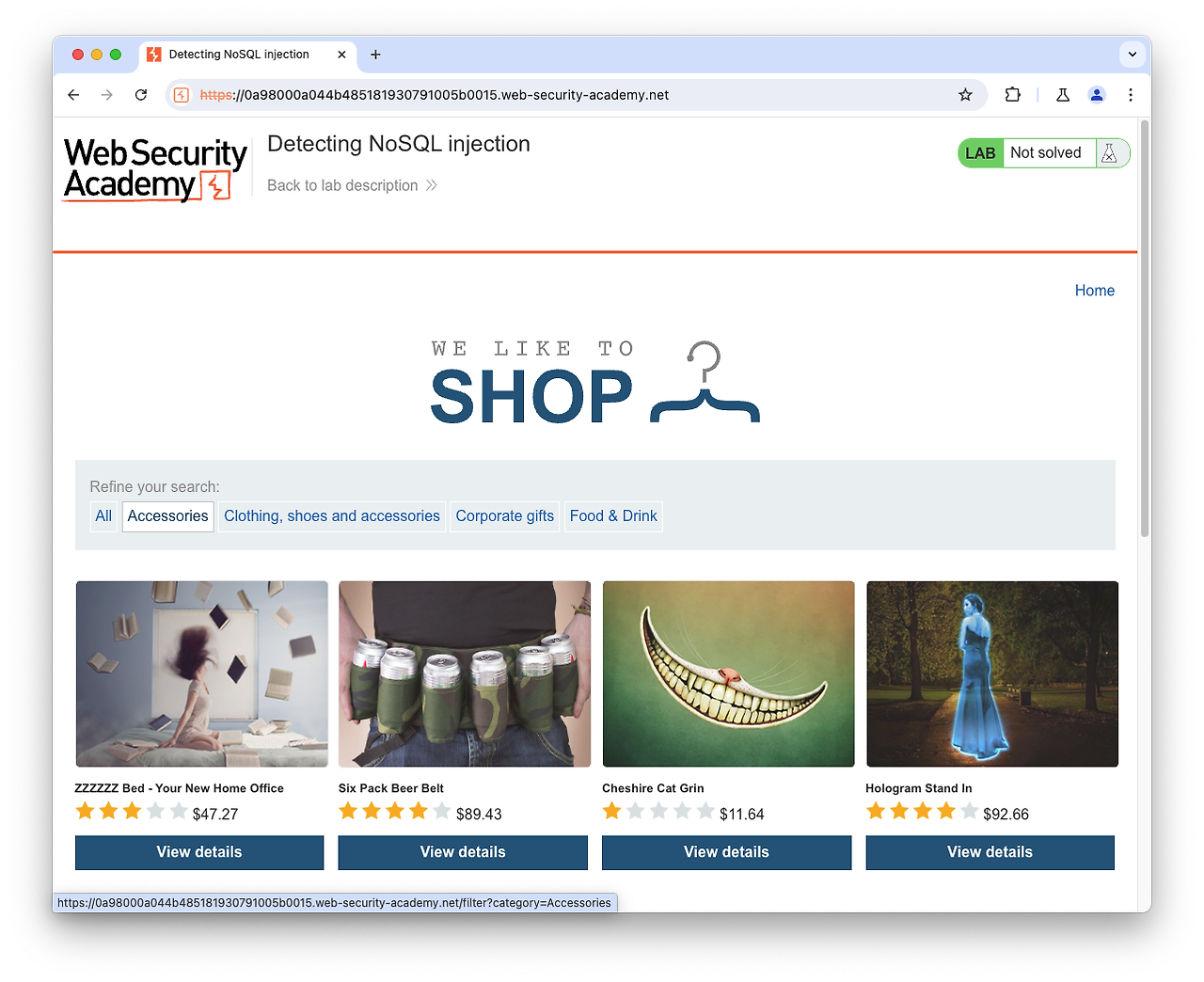 위와 같이 참의 값을 반환하고 password 부분을 주석처리 해주는 구문을 입력할 경우 참의 값이 반환되며 로그인이 가능해집니다. 이와 관련해 burp suite PortSwigger에서 제공되는 랩을 통해 실습해 보았습니다.(Lab: Detecting NoSQL injection)